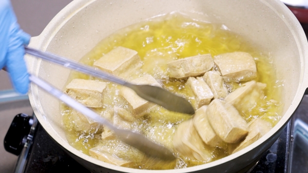 用筷子測式高溫,有冒泡代表達到可酥炸的溫度,再次回炸,使豆腐表皮更酥脆