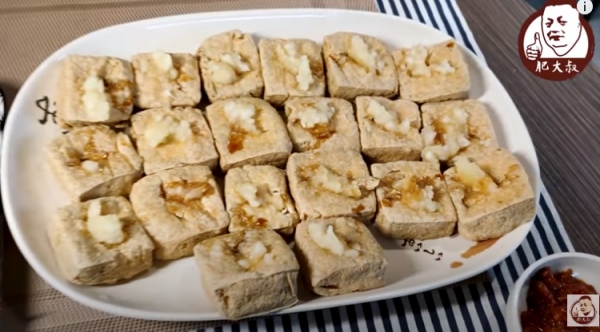 挖洞放入蒜泥、豆瓣醬,旁邊放入泡菜大快朵頤